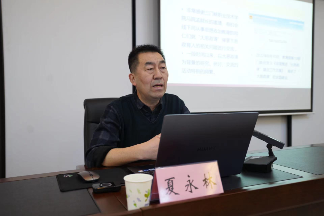 西安电子科技大学世界杯体育官方网站夏永林教授以《以“大思政课”理念推进思政育人的思考》为题,从“大思政课”的提出、“大思政课”多维内涵及思政育人理念、“大思政课”背景下思政协同育人思考三个方面进行了详实而生动的讲解。报告主题明、视角新,具有很强的针对性和实操性,以“大思政课”的提出背景为切入,通过“育人理念”“育人体系”“育人过程”“育人主体”“育人格局”五个维度全面诠释解读了“大思政课”的内涵和育人机制,紧扣推进“大思政课”需破解的难题,提出以“大思政课”理念与思维,统筹协调思政育人的多主体、多平台、多资源、多方式、多手段,善用社会“大课堂”、搭建“大资源”平台、构建“大师资”体系、建设工作“大格局”,切实推动高职院校思政育人提质增效。