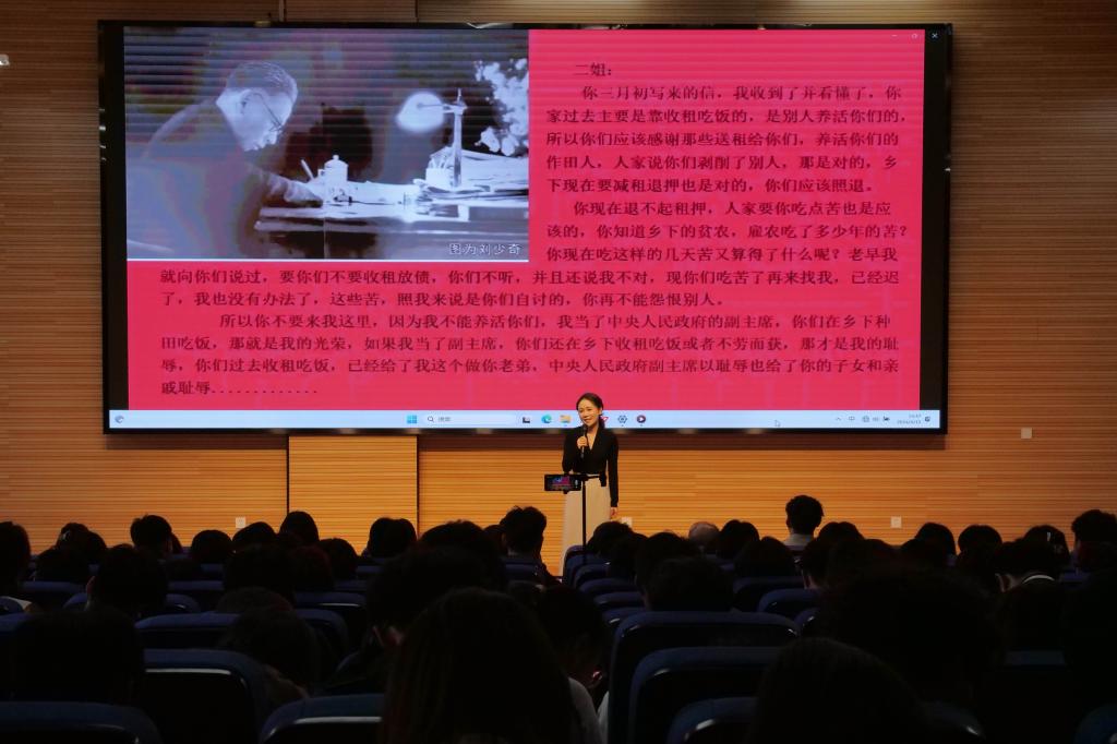 在一幅幅珍贵的历史图片前,来自兵站旧址的讲解员通过“邮说少奇”流动展览,给在场师生讲述了刘少奇同志在豫西八路军兵站的动人故事和刘少奇同志的光辉一生。随后,在四号楼报告厅兵站旧址工作人员进行了《知行合一刘少奇》宣讲。宣讲以习近平总书记在纪念刘少奇同志诞辰120周年座谈会的讲话为主线,把《论共产党员的修养》的理论性与故事性、欣赏性相互结合,以红色故事、歌曲、诵读经典等方式呈现,给现场师生展示了一场别开生面的思政大课。