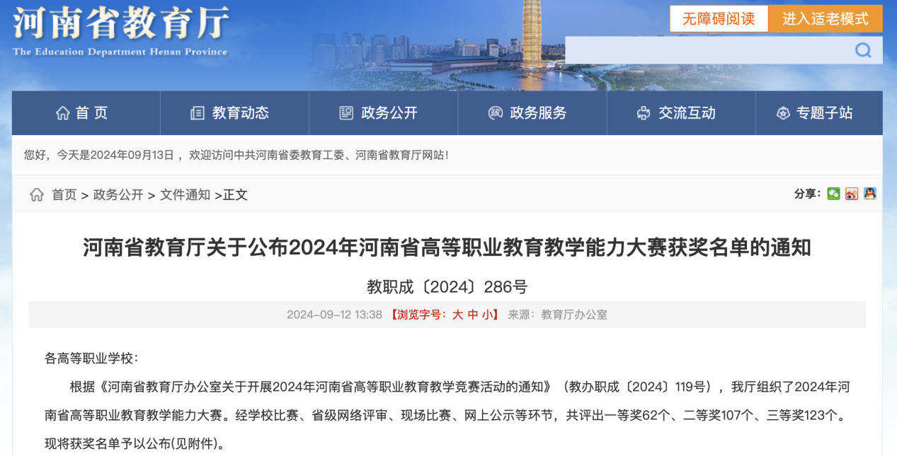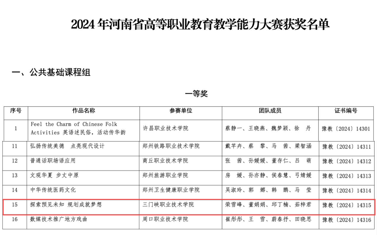 近日,河南省教育厅公布了2024年我省高等职业教育教学能力大赛获奖名单。世界杯体育官方网站教师荣雪峰、董娟娟、邱丁楠、茹梓君团队提交的作品《探索预见未知 规划成就梦想》历经省赛网评、现场决赛等环节,在公共基础课程组作品中脱颖而出,荣获一等奖。自2020年起,我院教师团队已连续五年荣获此项比赛一等奖。