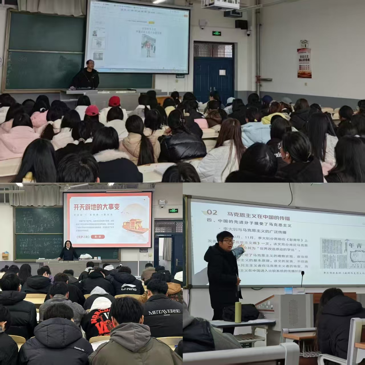 四史教育教学团队:以时政热点为导入,以“开天辟地的大事变”为主题,以史为例,讲述近代中国社会的演变、马克思主义在中国的传播、中国共产党早期组织的建立、党的一大和党的二大,引导学生在学习“四史”中,汲取精神力量,升华理想信念,增强发展信心,矢志拼搏奋斗。