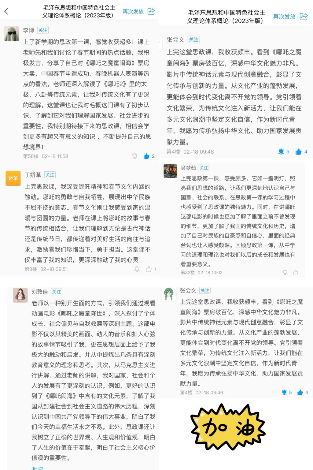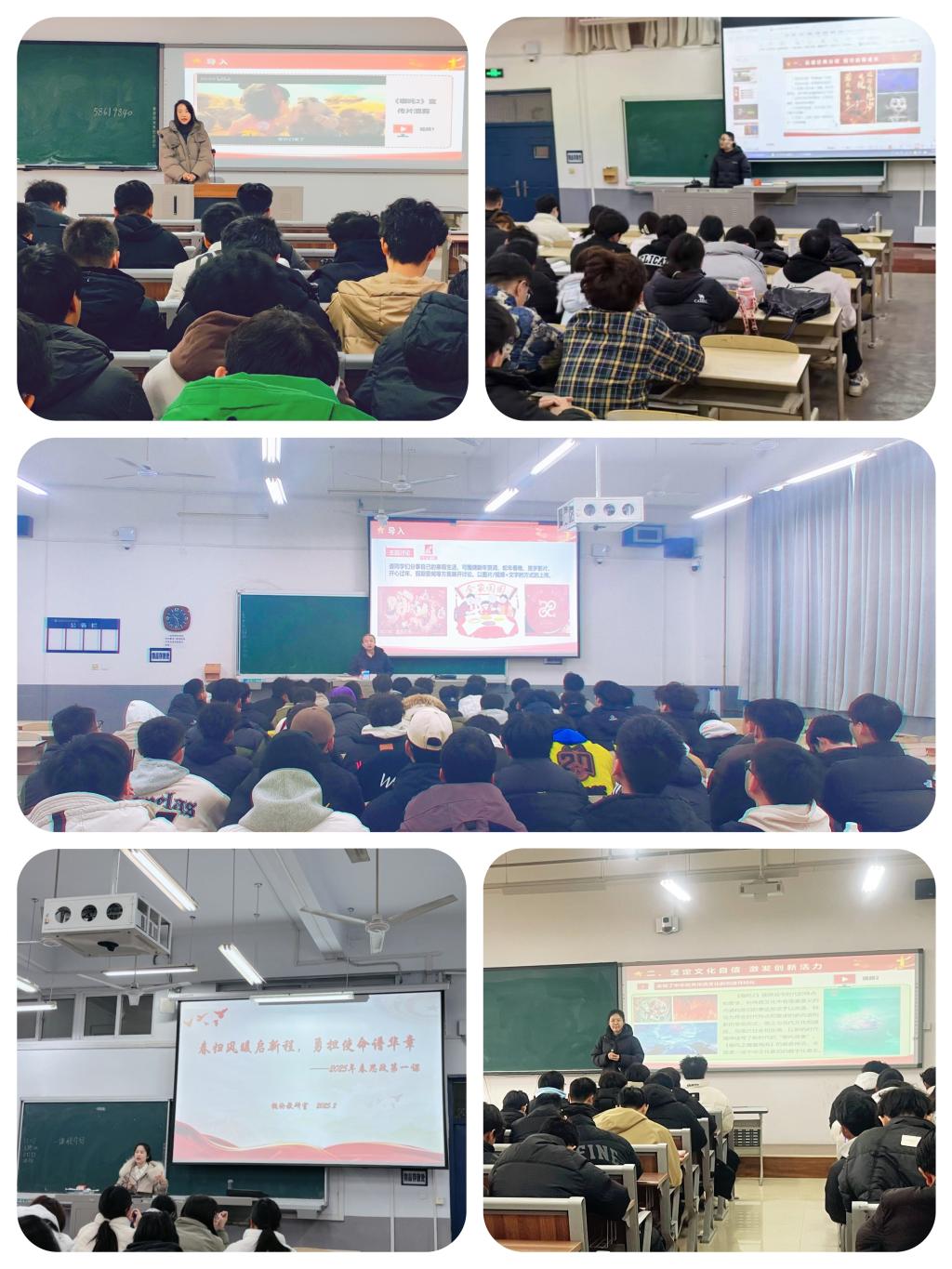 毛泽东思想和中国特色社会主义理论体系概论教学团队:以“春归风暖启新程 勇担使命谱华章”为主题,从“品读经典台词 指引自我成长”“坚定文化自信 激发创新活力”“敢于死磕到底 匠心铸就梦想”“感悟时代发展 凝聚奋进力量”四个方面展开讲述。教学过程中,主题讨论、抢答、影片经典片段配音秀等活动贯穿其中,DeepSeek的研发使用、黄旭华院士的事迹、饺子导演的人生经历等案例有效融入,给同学们带来了一堂“走新更走心”“有趣又有效”的思政第一课。