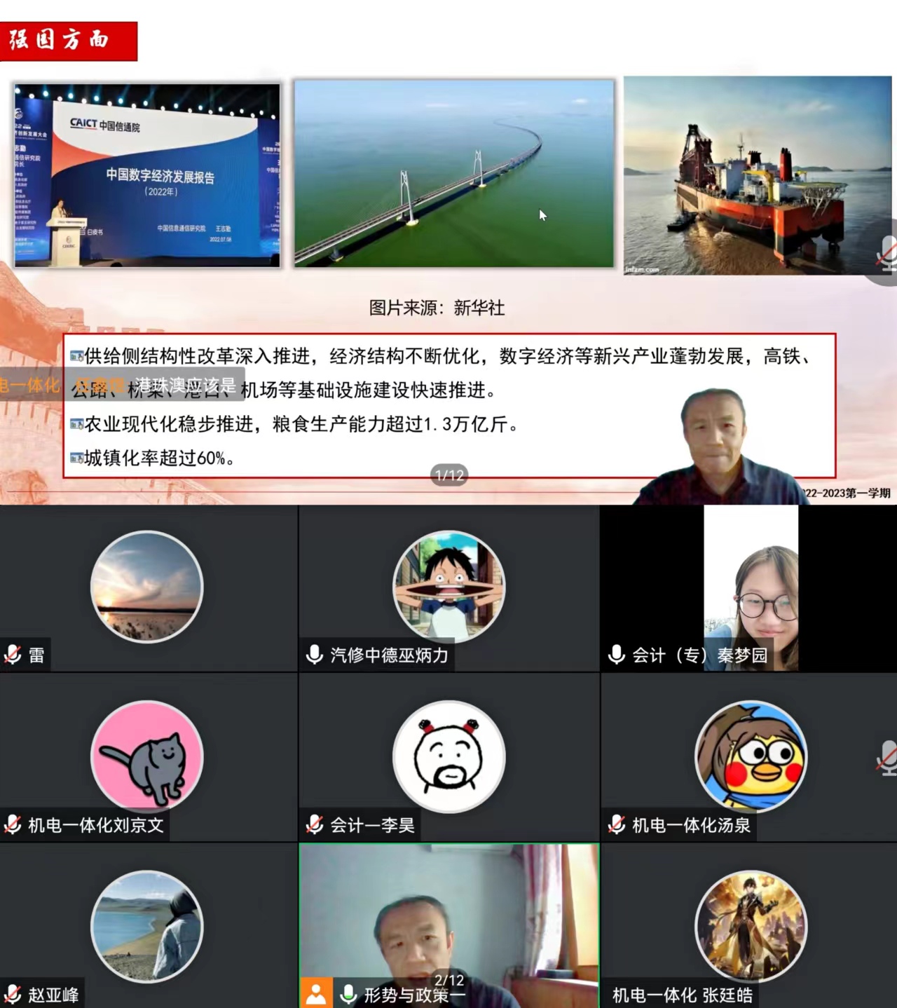 坚定信心战疫情,共克时艰谱新篇。为落实学院秋季开学“延迟返校不停教、不停学”的要求,8月29日上午,世界杯体育官方网站刘通老师紧密结合当前疫情形势及形势与政策课程特点进行重组、延伸,以“喜迎二十大 奋进新征程”为主题开展线上开学思政第一课《开创中国特色社会主义新时代——深刻领悟“两个确立”的决定性意义》。党委书记杨彤,党委委员、副院长黄世谋,教务处处长员莹,世界杯体育官方网站院长孟昭阳参与线上观摩。